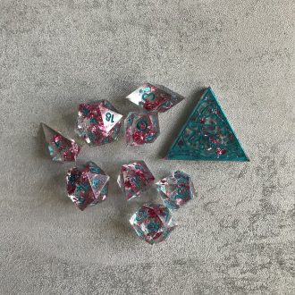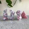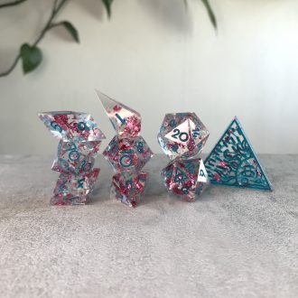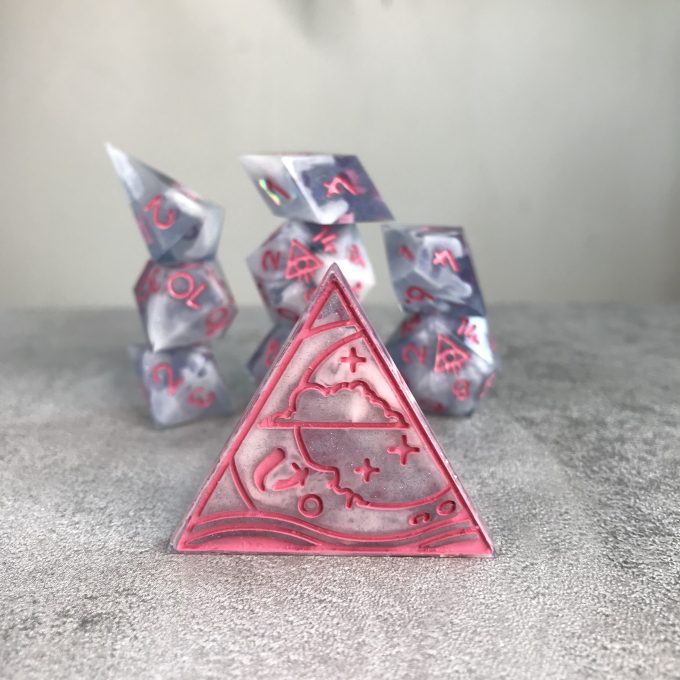 D20 Dice SetsA glittery lilac shimmer filled with soft, dreamy clouds. The bubblegum pink numbers playfully pop, making these dice feel like a sweet summer day spent at the bouncy castle.