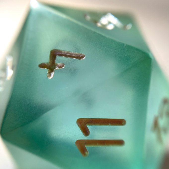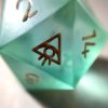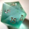 Chonks, DiceTranslucent sea green D20, sanded to resemble weathered pieces of glass found along saltwater beaches. Inked with a sandy pearl ink. Embracing childhood memories of sunshine, sand between your toes, ice cream, seashells and sea glass.